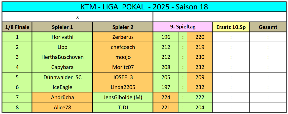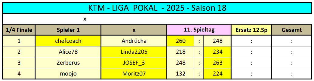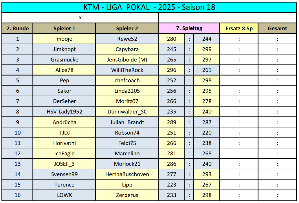 Beim Liga-Pokal nehem alle 72 Tipper der KTM teil. Gespielt wird je ein KO-Spiel an den Spieltagen 05 / 07 / 09 / 11 / 13 / 15 Bei Gleichstand gibt es an den Spieltagen 06 / 08 / 10 / 12 / 14 / 16 ein Entscheidungsspiel
